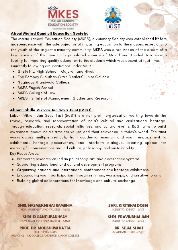The Malad Kandivli Education Society (MKES), a visionary Society was established before independence with the sole objective of imparting education to the masses, especially to the youth of the linguistic minority community. MKES was a realization of the dream of a few leaders of the then thinly populated suburbs of Malad and Kandivli to create a facility for imparting quality education to the students which was absent at that time. Late Shri Kantilal Nahalchand generously donated 9000 sq. yards of plot and an amount of Rs.1.11 lacs as donation towards the construction of a school building. This motivated the community to contribute handsome amounts to realise the dream of their leaders and thus, in 1942, the Sheth N.L. High School was established with two mediums of instruction - Gujarati and Hindi.