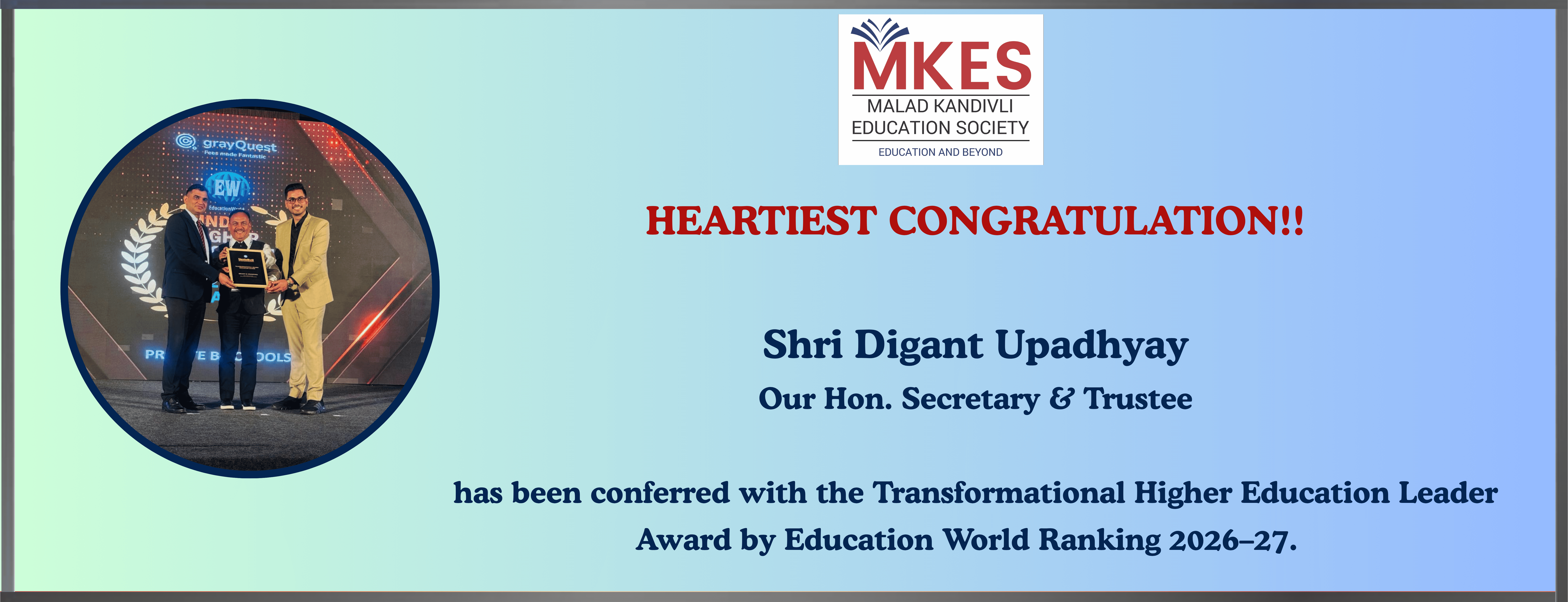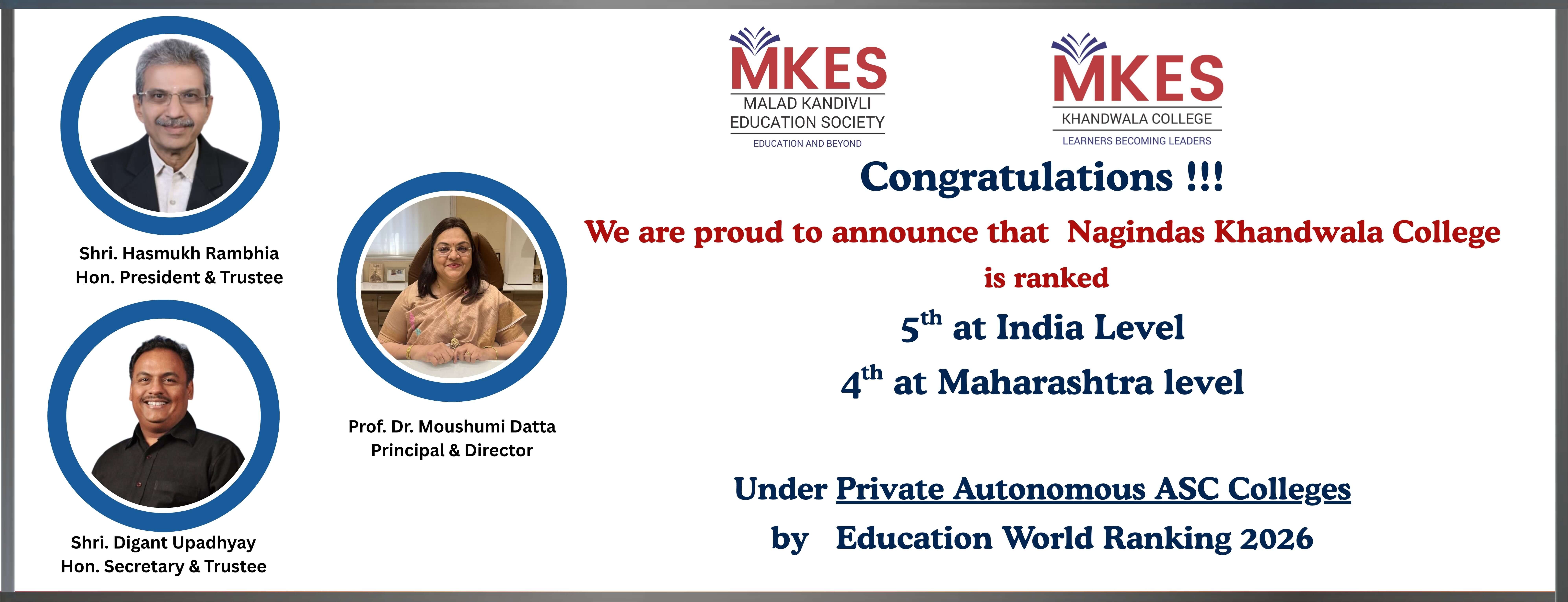 MKES since its inception in 1942 has been contributing to society in the field of education. Having imbibed from our scriptures that “Knowledge Alone Liberates” we have been continuously evolving and currently our “Bhavishya Bharat Campus” consists of Schools, Junior College, Degree College and Law College offering education from K.G. to Doctoral Programmes in various streams.